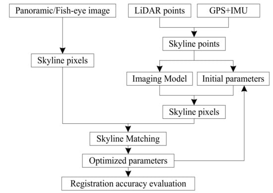 We propose utilizing a rigorous imaging model and skyline-based method for automatic registration of LiDAR points and a sequence of panoramic/fish-eye images. This method improves the accuracy of registration automatically through optimizing attitude parameters. Figure 1 shows the flow chart of this method. This paper is organized as follows. Section 2 provides the rigorous panoramic/fish-eye image registration model and the skyline matching method. In Section 3, conducted experiments that verify the effectiveness of the skyline-based method are described. Section 4 discusses the parameters in skyline pixels/points matching and the precision/automation of our method. Finally, conclusions are presented in Section 5.