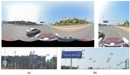To compare the accuracy of different registration methods, 38 control points are selected manually; these points are mainly distributed on the corners of buildings and billboards, the tops of lamps, etc. As shown in Figure 1 and Figure 3, the panoramic and fish-eye images contains 38 and 19 control points, respectively; an exception is that only 17 control points are in the fish-eye image (N + 2). In Appendix A, Table A1 lists the 3D coordinates of the 38 control points obtained from the LiDAR points; Table A2 lists the 2D image coordinates of the 38 control points in the panoramic image; and Table A3 lists the 2D image coordinates of control points in the fish-eye image.