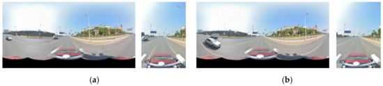As shown in Equation (3), for a panoramic image using the spherical model, take vertical angle (v) as the row coordinate and the horizontal angle (h) as the column coordinate. Considering and , the size of the panoramic image column is 2 times that of a row.