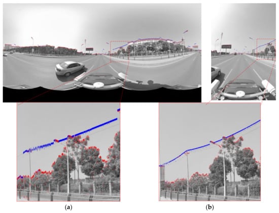 Because the difference in the image pixel value between the sky and other objects is significant, the skyline can be easily extracted by this feature. The first grey jump as the skyline pixels are searched from above to below and column by column, the skyline pixels (blue pixels) extracted from the panoramic/fish-eye image can be obtained, as shown in Figure 5a,b, which include the top profile of buildings, trees, billboards, power lines and street lamps. Considering the linear feature of a power line and the discrete characteristics of LiDAR points, power line points extracted from LiDAR points are incomplete; thus, power line pixel interference must be eliminated by setting a jump buffer. Figure 5a,b show skyline pixels (red pixels) after optimization in which the power line pixels have been eliminated.