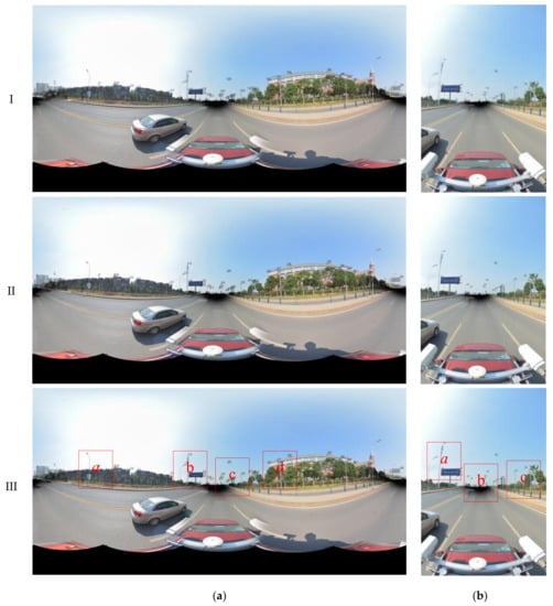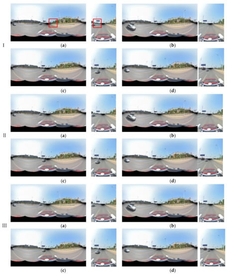 Figure 14 and Figure 15 show the local image with 3 methods to compare the effectiveness of the registration. Our method has obvious optimization effects compared with method I and approaches the effect of method III. Moreover, our method is completed without manual intervention, unlike method III. For quantitative analysis, Table 3 lists the imaging position and angle correction value of a sequence of panoramic/fish-eye images using our method, Table 4 lists the registration accuracy of a sequence of panoramic/fish-eye images for the 3 methods considered.