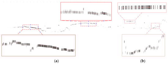 Matching skyline pixels, black pixels express real image skyline, display with 10 pixels width, red pixels express synthetic image skyline. (a) Panoramic image skyline (n = 1420); (b) Fish-eye image skyline (n = 454).