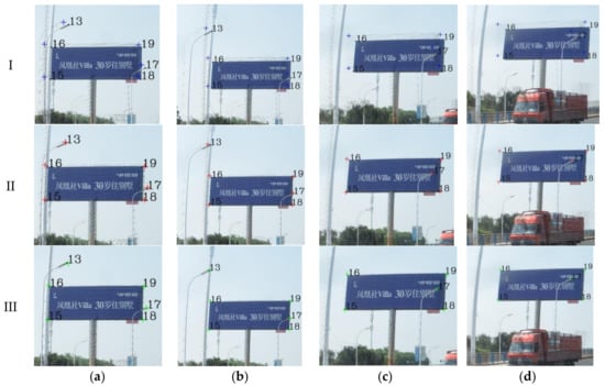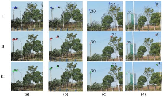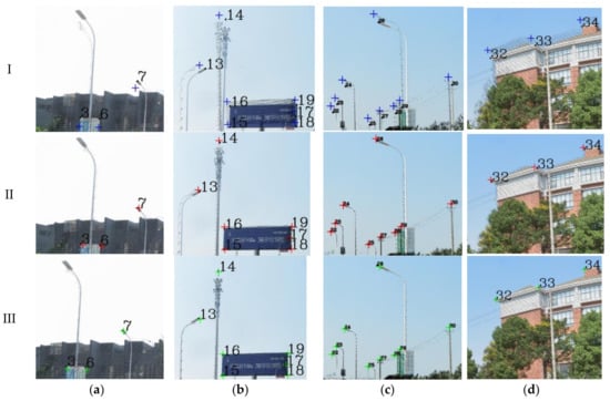 Local effect comparison of panoramic image registration, black squares express real location of control points; blue, red, and green crosses are synthetic location of control points calculated by method I, II, and III respectively. (a) Building and Lamp; (b) Lamp and Billboard; (c) Lamp; (d) Building and Tree.