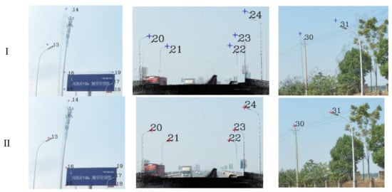 To compare the accuracy of our method, the original registration method, the skyline-based registration method and the control point registration method (referred to below as method I, II and III, respectively) were used for the panoramic/fish-eye image registration. First, the original registration (I) was conducted according to Equations (1)–(3), and the registration parameters (f,XS,YS,ZS,rx,ry,rz) were obtained by GPS/IMU and MMS calibration. Second, by taking advantage of control points for registration (III) according to Equations (4) and (5), this method does not require the initial value. The registration results of the panoramic/fish-eye image (N) with method I and III are shown in Figure 6.