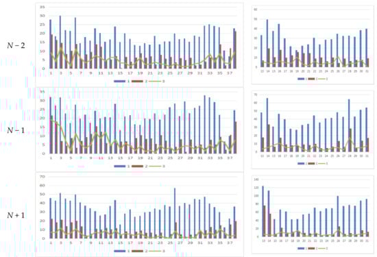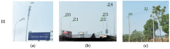 As shown in Table 3, the interval between sequence images is approximately 7 m, and the road height difference is within 0.3 m. The angle correction values of each panoramic/fish-eye image are different. Although the difference is small in most cases, it must be solved separately, rather than used directly for the next image. Table 4 shows that the registration error of method III is the smallest; the error of method II is approximately 2 times that of method III; and the error of method I is approximately 3 times that of method II. For further analysis, as shown in Figure 16, the position error of each control point using the 3 methods in a sequence of images is analyzed in detail.