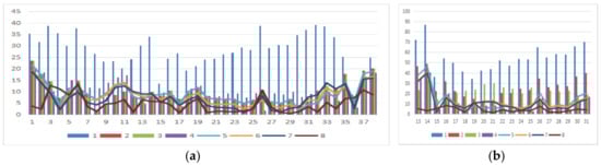 The error of 38/19 control points in the panoramic/fish-eye image with 3 methods, series 1 expresses the error of each control point in method I; similarly, series 2–7 express 6 iterations of our method, and series 8 expresses the result of method III. (a) Panoramic image; (b) Fish-eye image.