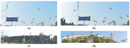 Control points displayed in the panoramic/fish-eye image. (a) Fish-eye image (No.13–31); (b) Panoramic image (No.12–31); (c) Panoramic image (No.1–11); (d) Panoramic image (No.32–38).