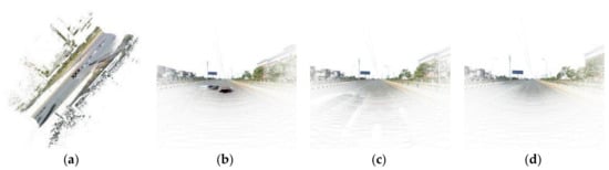 LiDAR points can be given an RGB value after registration, so the points not only contain spatial information but also have texture information. Using texture points can achieve a texture image with any position and attitude. The procedure follows by setting the current imaging position as N, N − 1 and N + 1 to express the imaging positions before and after N in the sequence images, as shown in Figure 12a. We generate an image according to the perspective imaging model. The main axis is along the road direction and the other rotation angle is 0°. The imaging focal length is 250 pixels and the imaging size is 1000 × 1000. Figure 12b–d show the imaging results. Through texture points imaging, we can obtain the scene from an arbitrary location and attitude to meet different vision requirements.