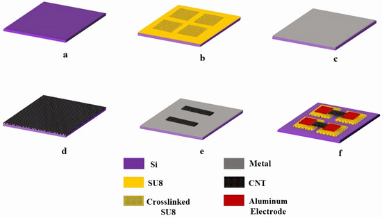 Vacuum filtration enables the formation of a uniform nanotube network and allows a precise control over the thickness of the film depending on the amount of solution used. More importantly, vacuum filtration is a room temperature deposition method and is of low-cost compared to other techniques. The nanotube film is deposited on a nitrocellulose membrane. After vacuum filtration, the film is washed in deionized (DI) water to remove any traces of surfactant that may be present on the surface. Then, the carbon nanotube film is transferred onto the substrate. The film is cut into the desired shape and size and transferred onto the substrate by dipping the nanotube film in chlorobenzene. The substrate is then dipped in acetone for 60 min to dissolve the nitrocellulose membrane. The resulting nanotube film thickness is between 0.5–0.7 µm depending on the amount of solution used. The nanotube film is then patterned by UV lithography. After development, the nanotube film is etched using oxygen plasma (Figure 1e). After the plasma step, the barrier metal is etched by wet etching. The next step of the process is to remove the uncrosslinked SU8 by dipping the substrate in Developer for 60 s to release the suspended structures, and the final step of the process is to deposit 50 nm thick Aluminum electrodes (Figure 1f). For the non-suspended carbon nanotubes, the nanotube film was directly transferred onto the substrate, patterned and etched using oxygen plasma using the same gas flow rates and chamber pressures as in the case of suspended carbon nanotube devices to minimize variability. Aluminum electrodes were then patterned onto the nanotubes for electrical measurements.