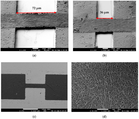 Figure 2a,b shows Scanning Electron Microscope (SEM) micrographs of suspended nanotube beams across the SU8 “pillars”. Figure 2c shows a conventional non-suspended device, and Figure 2d shows a high magnification micrograph which shows the networks of nanotubes comprising the beam. The nanotube beam is suspended at a height of 3.5 µm above the substrate. After fabrication, the humidity-sensing characteristics of both types of sensors are recorded by measuring the change in resistance of the devices.