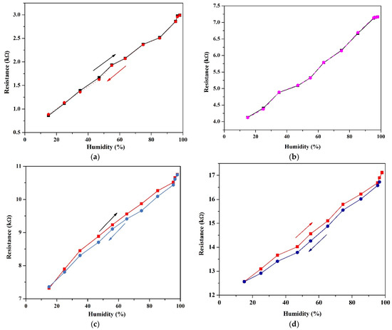 As shown in Figure 4c,d, for the non-suspended devices, devices with similar channel lengths of 36 µm (Device C) and 72 µm (Device D) had a base resistance of 7.3 kΩ and 12.56 kΩ respectively at 15% humidity. At 98% humidity, the resistance was 10.755 kΩ and 17.11 kΩ for devices C and D, respectively. The devices showed an almost linear response to humidity. The non-suspended devices exhibit similar hysteresis characteristics. The hysteresis is caused by water molecules on the substrate, agreeing with the work reported in [28]. The high resistance of the non-suspended devices is possibly due to the presence of charge traps and defects within the substrate which limit the flow of charge carriers in the network while in the case of suspended devices, the lack of substrate interactions provides a smoother pathway for charge carriers.