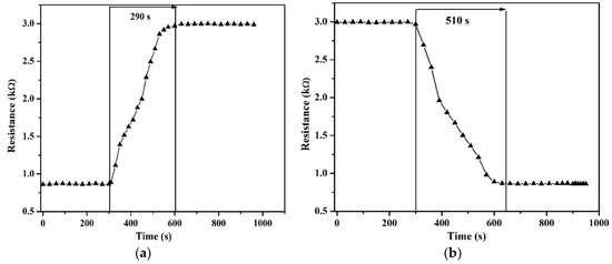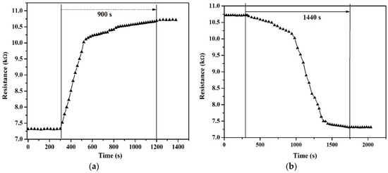 Figure 5a,b and Figure 6a,b show the rise and fall times of both types of sensors. The response time of the suspended structures is 290 s as compared to 900 s for the non-suspended devices. The faster rising response of suspended structure is due to the increased surface area of the device thanks to the flow of humidity below the beam enabled by the suspension of the nanotubes beam. The recovery or fall times are 510 s and 1440 s for suspended and non-suspended devices, respectively, outlining again the advantage of the suspended structure.