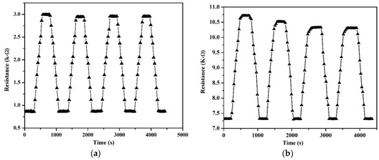 The longer recovery time of the non-suspended devices could be due to the presence of water molecules on the nanotube network during the desorption process and to the reduced surface area available for desorption. Figure 7a,b shows repeatability of the devices by plotting resistance as a function of time for four continuous humidity cycles under continuous humidification from 15% to 98% RH. The resistance of each device was allowed to stabilize for a few minutes before the beginning of each cycle. The suspended humidity sensor showed very consistent resistance values even after 3 cycles whereas the non-suspended sensor began to show drifting performance, outlining the compromised dynamics due to the reduced surface area and absent gas flow below the beam.