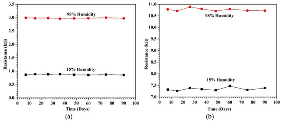 Figure 3a,b shows the schematic of the test setup and a photograph of the setup used for the measurements. The sensors were interconnected using probes aligned with micro positioners. A humidity chamber with an external humidity source was used for the measurements. The initial humidity was of 15% RH. The percentage humidity inside the chamber was verified using a high-precision sensor embedded within the humidity chamber. The compressor inside the humidity chamber could not be used to produce humidity since the vibrations led to the probes scratching the metal electrodes and destroying the devices. Accordingly, an external humidifier was used to inject water vapor into the chamber and a nitrogen tank was used to quickly flush out the humidity when required. Nitrogen was chosen as a carrier gas in order to maintain an inert environment within the chamber. The resistance of the devices was measured using a Keithley Digital Multimeter. The multimeter was in-turn connected to a computer for data acquisition. The resistance was allowed to stabilize inside the chamber for 30 min prior to the first measurement.