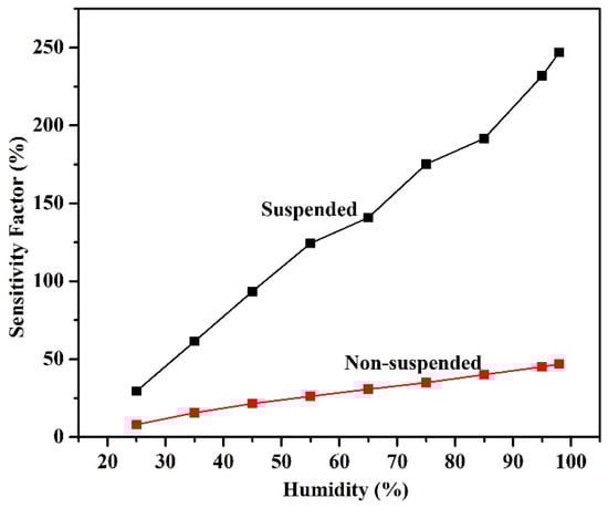 where RH is the resistance at the measured value of resistance, and R0 is value of baseline resistance. Since the suspended nanotubes beam is not connected to the substrate, the water molecules have both the top and bottom surface to adhere to which increases the sensitivity of the sensor. Figure 9 shows a plot of the sensitivity factor of both suspended and non-suspended sensors as a function of the relative humidity.