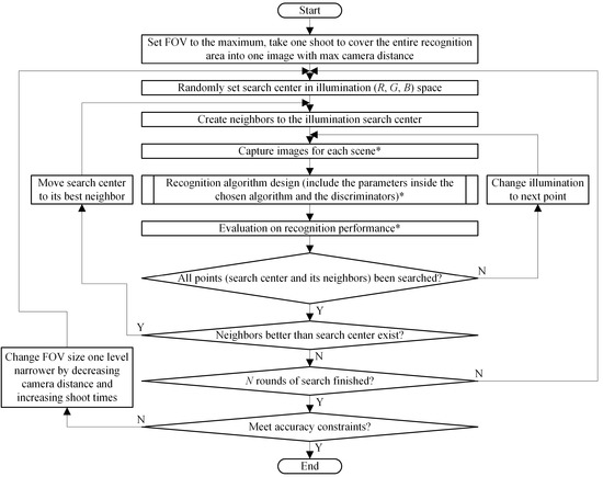 Proposed algorithm to design FOV, illumination and image pre-processing parameters for recognition system. *: The procedures will be skipped if the current selected point has been searched before.