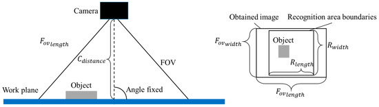 The FOV is applied to the vision system in the following two ways: first, carry out recognition once with an FOV size and just fit the size of the recognition area and second, carry out recognition by scanning the entire area n2 times with a FOV of a specific size. Figure 2 shows an example of taking an image of an object placed in the area for recognition. Since the angle between the viewpoint of the camera and the work plane is fixed, which is stated in the preconditions, the FOV size could be easily estimated from the distance between the camera and work plane.