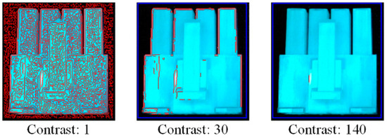 Contour models (marked with red lines) made by different contrast values, the number of contours decrease as the contrast increases. Less contours in a model increase the number of detections that should be matched and thus result in a longer time taken for matching. Algorithm proposed for contrast value design of the chosen recognition algorithm [HALCON (an image processing library of MVTec Company) shape-based matching].