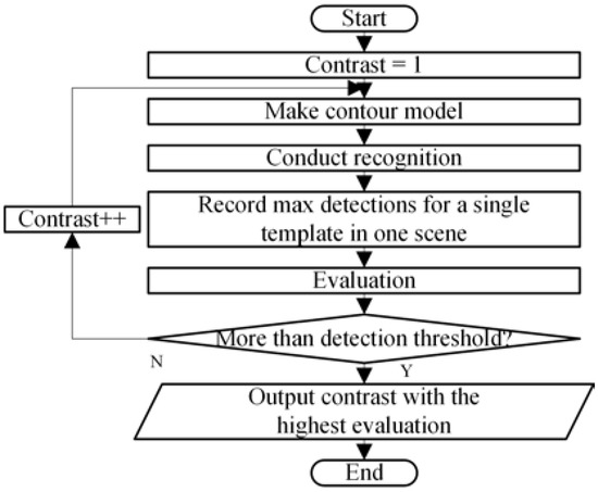 Based on this principle, the design method for the contrast value in shape-based matching is set to traverse all the possible values from the minimum to the maximum and end if the detection number reaches a threshold (Figure 4).