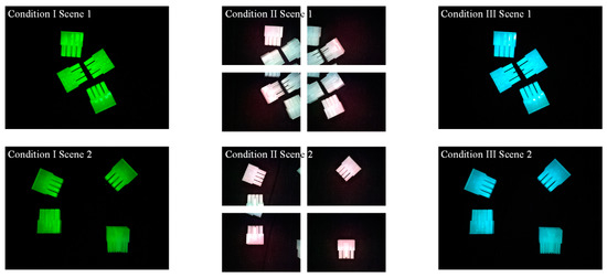 Moreover, illumination in the designs with high evaluations showed no relations to each other with greyscale images input, while a clear pattern was discovered in the circumstance of R-channel images. Based on Table 4, illuminations of the best-three designs were found with low red illumination (under 50), high green illumination (near 225), and relatively high blue illumination (from 150 to 240). Generally speaking, tuning green and blue illuminations is not effective when the image can only be seen using a red channel. However, Figure 8 shows that even with no red illumination, the objects are visible in the R-channel image. The probable reason may be that the RGB tuned from the illumination side is not the same as the RGB information contained in an image. Because of the wavelength of the illumination device or some reflections, the G and B components could still influence the R-channel image to some extent. Actually, such an influence eventually resulted in ‘clearer’ R-channel images compared with the greyscale ones. The illumination pattern found in Condition III also confirmed the importance of green and blue illumination. In addition, patterns of illumination indicated that relations might exist between the recognition performance and its illumination conditions, which give rise to possibilities for the application of other optimisation methods.