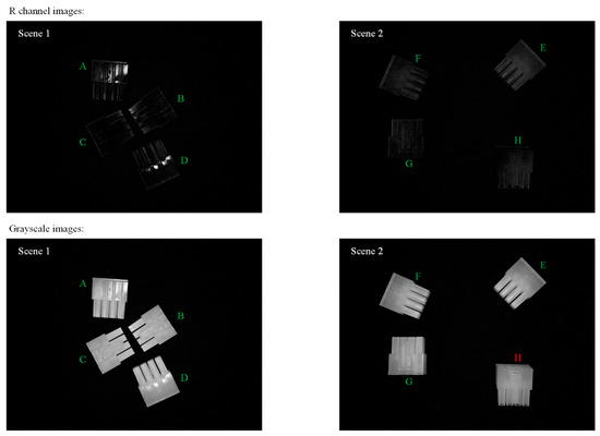 In order to further discuss the effects of R-channel images, the R-channel images for the two scenes under the optimal design of Condition III (illumination RGB equals to 15, 225, and 240, 1 shoot) were extracted. We processed the two figures with greyscale; both R-channel and greyscale figures are shown in Figure 7. Moreover, to confirm that the R-channel images perform better than greyscale images under the same situation, an additional design was implemented with greyscale images, as shown in Figure 7. Results showed that the optimal design with the greyscale images could only provide an Fmeasure of 0.93.