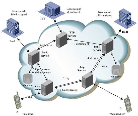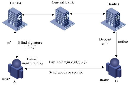 A logins into his account, draws e-cash m from the -A, blinds m by using blind factor f, and then obtains . The -A signs on , and sends the signature to A [28]. A unblinds the signature by using f and obtains . A sends the tuple to B. B verifies whether it is valid or not, if it is, he sends the tuple to -B. The -B deposits the money on B’s account.