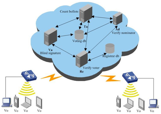 E-voting system: the voter, registrar, administrator, tallier, nominators, and validator are denoted as , , , , , and respectively. The protocol is presented in Figure 2 [4]: