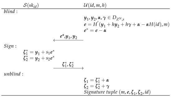 - Rückert, M. Lattice-Based Blind Signatures. In Advances in Cryptology—ASIACRYPT 2010; Abe, M., Ed.; Springer: Berlin/Heidelberg, Germany, 2010; pp. 413–430. [Google Scholar]