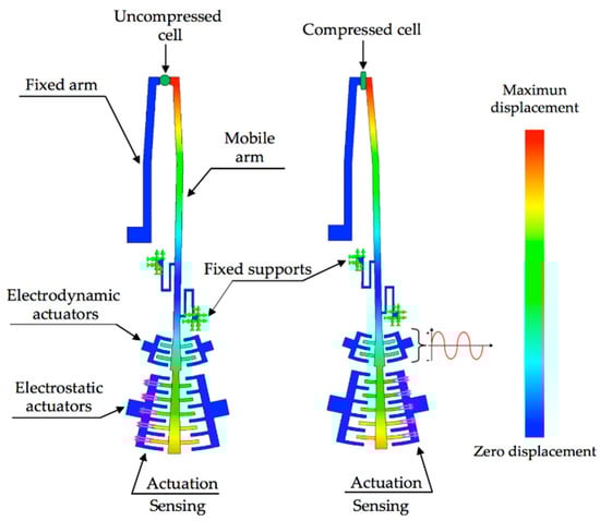 Figure 4 depicts the operation principle of the microgripper for monitoring stiffness and elastic modulus of CTCs. Adjustable actuation voltages are applied to comb-drive electrodes that generate electrostatic torques at the mobile arm, which allows opening and closing displacements between the microgripper tips. These displacements can be adjusted to catch potential CTCs after that they are filtered from a patient blood sample using a microfluidic platform [12,13,14,15,16,17]. First a dc bias voltage will be applied at the electrostatic comb drive actuators to produce an electrostatic torque that moves the mobile arm at the closing direction of microgripper. Next, the dc bias voltage is modified to adjust the closing displacement of the microgripper and thus it can capture one cell. Then, an ac bias voltage is supplied at the electrodynamic comb drive actuators to produce small alternating electrostatic forces that generate oscillating motions of the mobile arm. Thus, the microgripper tips squeeze the cell with an alternating electrostatic force and the displacements of the deformed cell can be measured through the capacitance shift of the electrostatic actuators. These variations of the displacements and capacitances are related with the elastic modulus and stiffness of the gripped cell. Finally, the measurements of these mechanical parameters of the gripped cell will be compared with the elastic modulus and stiffness values of CTCs from different tumor types. If the measured elastic modulus of the compressed cell matches with that of CTCs then the gripped cell originates from a tumor.