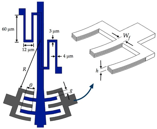 where ε0 is the air permittivity, θ is the overlap angle between the comb drive electrodes, h is the thickness of the comb drive electrodes, R0 is the inner radius of the first comb drive electrode close to the pivot point, Wf is the width of the comb drive electrodes, g is the gap distance between the comb drive electrodes, n is the number of comb drive electrodes and V is the actuation voltage.