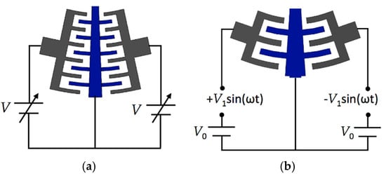 The interdigitated comb drive capacitors can be used for actuation or sensing. Figure 6 shows the electronic circuits for the electrostatic and electrodynamic actuators of the microgripper. For the electrostatic actuation, dc bias voltage (V) is applied to each side of the comb drive electrodes to achieve rotational motion of the mobile arm (see Figure 7a). On the other hand, the electrodynamic actuation is obtained providing an alternating voltage through a push-pull driving (see Figure 7b). A push-pull driving circuit is often considered as the best solution for driving when the forces are applied to the mobile structure from both sides, as in the case of the microgripper. For the electrodynamic actuators, ac voltages (VL and VR) supplied to the left and right sides of the push-pull driving are given as [45]:
