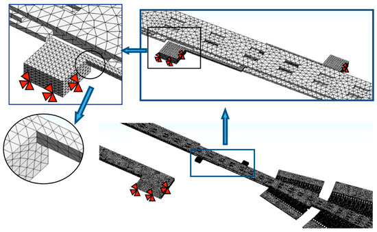 The stiffness modeling of the serpentine springs of the microgripper is obtained through FEM models. These models include a mesh with solid187 elements, as shown in Figure 12. The serpentine springs have refined mesh and are regarded fixed (red arrows in Figure 12) at their base, which are the joint surface with the substrate. The mechanical properties of polysilicon employed in FEM models are the follows: Young modulus of 160 GPa, Poisson ratio of 0.23 and density of 2330 kg m−3.