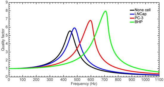 Based on the results shown in Figure 18, the dynamic behavior of the microgripper is affected by the changes at its resonant frequency and quality factor. The values of quality factor and resonant frequency of the microgripper increase when the elastic modulus of the gripped cells increment. Higher elastic modulus of the gripped cells can generate larger resonant frequencies and quality factors of the microgripper. These variations of the resonant frequency and quality factor can be used to discriminate between different cells types, determining their elasticity modulus by analyzing the frequency response curve traced with experimental results and studying the changes previously commented. The accuracy and reliability of the results will depend on the conditions of the experimental setup. Thus, the elasticity modulus values of the cells estimated through microgripper will be employed to distinguish CTCs from healthy cells.