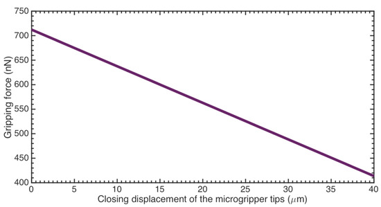 The maximum dc and ac actuation voltages are 23.4 volts and 129.2 volts, respectively. The difference between these voltage values is due to that electrodynamic comb-drive actuators have lower capacitance. Voltages V0 and V1 have the same magnitude (64.58 V) in order to maximize the actuation torque B. If the limit dc voltage is applied, the mobile arm could rotate up to 0.382 rad that allows a maximum displacement of 95.5 µm between the microgripper tips. Due to that real distance between the microgripper tips is 40 µm, the resulting energy is used to increase the gripping force. Figure 19 shows the reduction of the gripping force when the microgripper tips is closing. It is due to that mobile arm requires more energy to achieve a larger rotation angle (θz). Thus, if the gripped cell has larger size then the gripping force magnitude must be increased. The gripped cell size affects the rotation angle of the mobile arm θ. If the cell has a larger size then the mobile arm will have a less rotation angle. Considering the maximum ac actuation voltage, the maximum force of the microgripper is 1.21 µN, which is enough to characterize the mechanical properties of the cell with large elastic modulus (E ≈ 9700 Pa). Based on Equation (32), the designed microgripper can measure the elastic modulus and stiffness of CTCs with diameters less than 18.34 μm. The microgripper even is capable to characterize other elastic micro-objects with bigger elastic modulus. This microgripper can be implemented at the tip of a manipulator located on anti-vibration table to improve the alignment position of the cell between fixed and mobile arm. A misalignment between the cell and the fixed and mobile arms could modify the contact area with the microgripper tips, which will affect the measurements of the stiffness and elastic modulus of the cell.