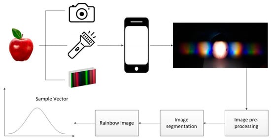 The proposed sensor system aims to acquire image data from certain objects, i.e., organic and non-organic apples, by coupling low-cost measurements with computer vision techniques. Using a simple flashlight to illuminate an apple, a diffraction image is generated and captured by a diffraction grating sheet and camera, respectively. Then we apply a series of computer vision techniques, including image pre-processing, segmentation and rainbow generation to convert the diffraction image into a sample vector for analysis. The overall sensor system is shown in Figure 1.