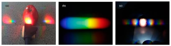 Diffraction gratings are an essential optical component in many fields such as spectroscopy, lasers techniques and optical communication. When polychromatic light reflects from or passes through a diffraction grating, it disperses into several rays travelling in different directions and each ray contains a unique wavelength or color. If we use a flashlight to illuminate an apple, spectra are generated on both sides of the apple which are severely dispersive (see Figure 2a). Diffraction grating can equidistantly slit a spectrum by wavelengths and produce rainbow color spectrum (also called rainbow, shown in Figure 2b) if a wide spectrum light source is being used. As different chemical elements (or compounds) have unique spectra which differ in the composition of the spectral lines, it is possible to detect the presence of a specific element by analyzing the intensity of a spectral line. In this paper, we choose a 60 × 40 nm diffraction grating sheet (less than 3 US dollars) as the experimental object. According to Figure 2c, rainbow images of an apple are generated via the diffraction grating sheet and their color spectra are symmetrically distributed.