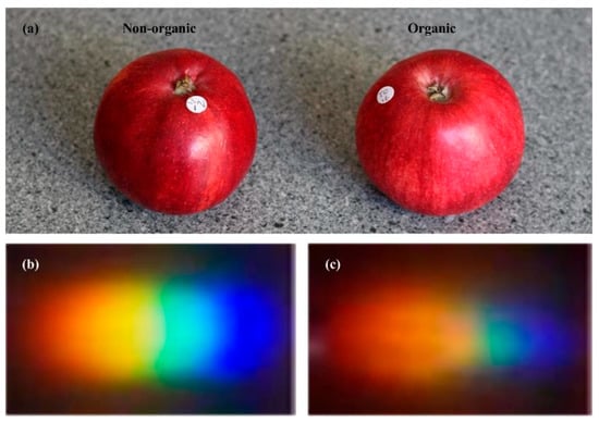 (a) Non-organic (left) and organic apple (right); (b) The rainbow image of an organic apple; (c) The rainbow image of a non-organic apple.