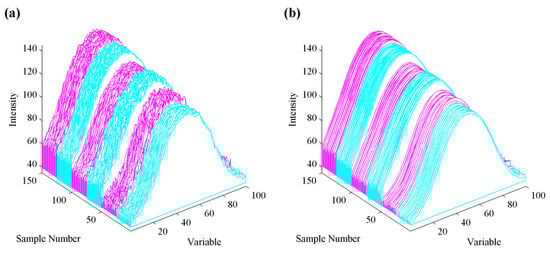 The raw (a) and pre-processed (b) apple data. Data in cyan and magenta color represents non-organic and organic samples, respectively. Sample 1–50, 51–100 and 101–150 belongs to Gala, Pink lady and Braeburn species respectively.