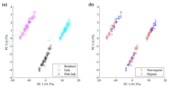 Score plots of the first two dimensions of PCA of apple data: (a) Braeburn, Gala and Pink lady species; (b) Non-organic and organic types.