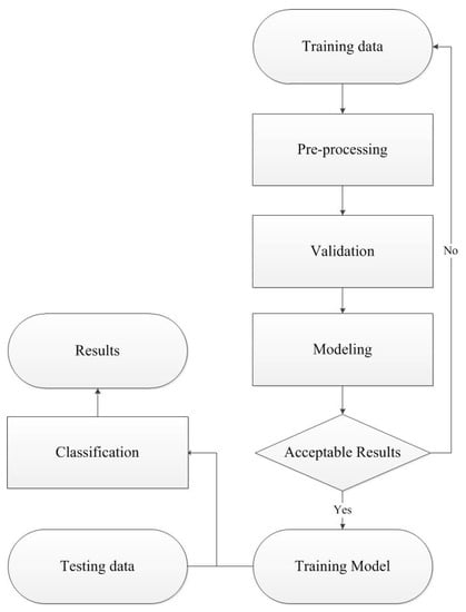 The pattern recognition framework for the classification of organic and non-organic apple data consists mainly of pre-processing, modelling, validation and classification procedures, as shown in Figure 9. It firstly applies pre-process techniques to reduce noise effects and unwanted variations existed in raw data which are caused by instrumental and experimental artifacts. A suitable pre-processing can decrease the error rate and complexity of classification models. Detailed information about pre-processing apple data will be provided in Section 4. Modelling procedure then uses classification algorithms to reveal the relationship between training data and their corresponding classes. To achieve the highest classification accuracy possible, the parameter(s) of a classifier requires to be optimized in validation procedure. Finally, the optimal model is selected to classify testing data.