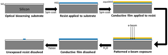 We chose HSQ as the resist with which to fabricate our nanostructures, in part because HSQ is negative-tone and therefore more efficient than positive-tone for fabricating the spread-out collection of nanostructures we desired. Furthermore, from reported ellipsometry measurements of HSQ films [17] and our own Abbe refractometer measurements of the liquid resist, HSQ refractive index is 1.39 ± 0.01, closely matching the assumed virion index of 1.42. Our specific EBL process is illustrated in Figure 1. We spin coated HSQ (XR-1541-002 or -004, Dow Corning Corp., Midland, MI, USA) onto the biosensing substrate (described in the next section), followed by soft bake on a hot plate at 150 °C for 5 min to evaporate solvent. To prevent troublesome charge accumulation during EBL, we spin coated a water-soluble conductive film (aquaSAVE, Mitsubishi Chemical Corp., Tokyo, Japan) on top of the HSQ film, followed by soft bake at 100 °C for 2 min to evaporate solvent. The CAD patterns were then written onto the chip with the following system parameters, which we settled upon after a number of trials: 30 kV acceleration voltage, 50 µm aperture, 16 mm working distance, 4625 µC/cm2 energy dose. After electron beam exposure, the chip was briefly immersed in distilled water to remove the aquaSAVE film and then dried with a purified N2 stream. Finally, the chip was immersed in a developer solution of 25% tetramethylammonium hydroxide (TMAH) in water (331635, Sigma-Aldrich Inc., St. Louis, MO, USA) for 23 s to remove unexposed resist, rinsed with distilled water and dried with N2.
