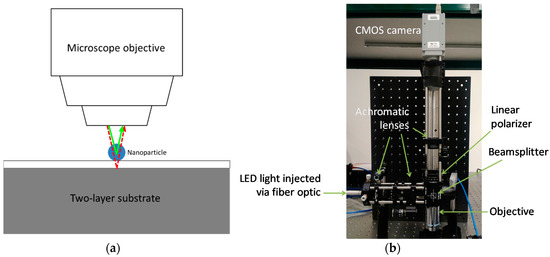 Based on the groundbreaking work from the Ünlü research group [1,2,3,4], we implemented an interferometric reflectance imaging biosensor as an epi-illumination brightfield microscope (Figure 2b). A multi-LED light source (WLS-22-A, Mightex Systems, Pleasanton, CA, USA) is fiber-optically coupled to an achromatic relay lens pair whose focal plane is aligned with the back focal plane of a 50×/0.8 NA infinity-corrected microscope objective (LU Plan EPI, Nikon, Tokyo, Japan), thus providing Köhler illumination onto the biosensing substrate. This objective is designed to be used in air without a coverslip at 1 mm working distance. A 50/50 cube beamsplitter reflects light from the relay lenses to the objective, and light reflecting from the sample returns through the objective and passes through the beamsplitter, to an achromatic tube lens which images onto a monochrome CMOS camera (PL-B771U, Pixelink, Ottawa, ON, Canada). A rotatable linear polarizer was inserted between the beamsplitter and tube lens for some of our imaging, allowing for isolation of any linear polarization state at the camera. The two-layer substrate is a silicon wafer coated with a 100 nm-thick thermal silicon oxide (SiO2) film (Silicon Valley Microelectronics, Santa Clara, CA, USA).