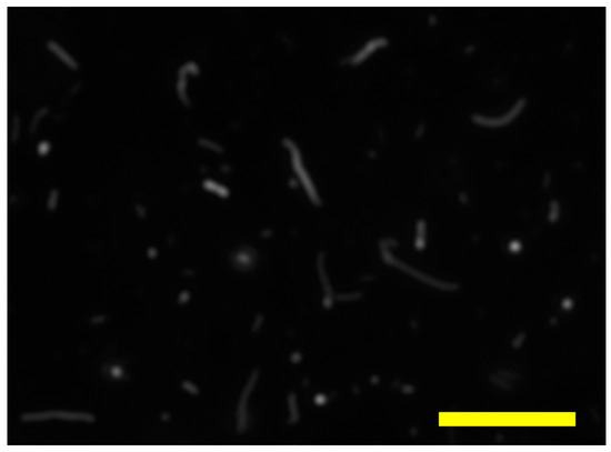 Fluorescence microscopy of EBOV VLPs, demonstrating filamentous morphology with varying lengths. Scale bar is 5 µm.