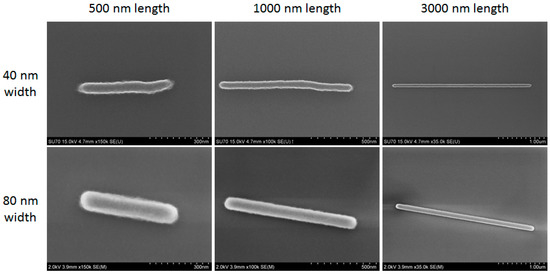 We fabricated a total of 48 nanostructures, comprised of eight groups of six different lengths. The eight groups arise from having duplicate sets of two different widths and two different orientations (vertical and horizontal). Thickness was defined primarily by the HSQ resist spin coat process and electron beam dose [22]. Figure 4 shows representative SEM images of the nanostructures. Though designed as rectangles, the final shapes have rounded ends due to the expected blurring effect of the electron beam’s point spread function. Rough edges in all structures result from randomness in electron and developer interactions with the resist. More gross shape errors were apparent in some structures (e.g., 500 × 40 nm and 1000 × 40 nm structures shown in Figure 4) due to occasional irregularities in the EBL system operation. All of these deviations from the ideal rectangular shape were considered negligible given their size relative to the overall structure size and to the wavelengths of light for biosensing.