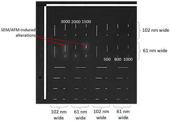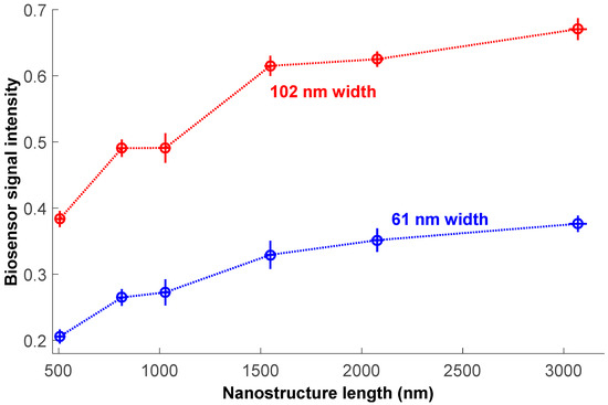 Figure 5 shows a representative biosensor image of our 48 nanostructures with 530 nm illumination. Additional structures with other lengths and widths were included in the EBL pattern to assist with orientation and positioning. Since SEM or AFM could alter a nanostructure and the adjacent surface, as is evident from the brightness variations of the left group of vertical 61 nm-wide nanostructures, one set of 24 was used for SEM/AFM measurements and the other set was left untouched for optical imaging. For our biosensor setup with NA of 0.8 and illumination wavelengths ranging from 400 to 656 nm, the diffraction-limited optical resolution (i.e., Airy disk width) ranged from 260 to 420 nm, below the minimum length of the nanostructures but well above their maximum width. Accordingly, from Figure 5, there are visual differences in length but all nanostructures appear to have the same width. The two different widths instead exhibit a clear brightness difference between them at this illumination wavelength.
