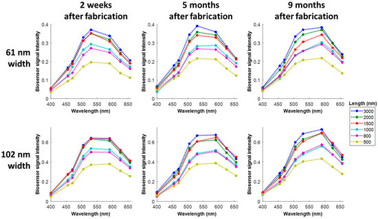 where Imax is the mean of the image intensities from the 25 brightest pixels in the object’s ROI and Iblank is the mean image intensity of the blank ROI. Normalizing by the blank intensity accounts for the illumination level at each wavelength. If the object ROI were also blank, then ideally (i.e., with zero noise and spatially uniform illumination) Imax/Iblank would be unity, so subtracting one sets the baseline value of B to zero. Figure 6 shows graphs of the biosensor spectra from the vertical nanostructures at three different time points: two weeks after fabrication, then 5 and 9 months after fabrication. In between imaging sessions, the chip was stored in a Petri dish at room temperature on a laboratory bench exposed to room lights. Except for values at 400 nm where the structures have very low reflectivity, intensities clearly increase with structure length and width across the entire spectrum, as expected, since a larger object generally tends to scatter more light. Apparent changes in the spectra over time can be attributed to HSQ/substrate material property changes (e.g., due to hygroscopicity), operator focusing variability across imaging sessions, and any long-term drift in our optical imaging setup. At any given timepoint, the shape of the spectra is markedly consistent across the different nanostructure lengths and widths.