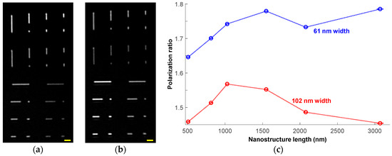 Polarization-induced changes in signal at 530 nm. (a) Vertically-polarized image. (b) Horizontally-polarized image. Scale bar is 2 μm in both (a,b). Note alternation of brightness between vertical and horizontal structures between the two images. (c) Polarization ratio (vertically-polarized B(λ) divided by horizontally-polarized B(λ)) for the six different lengths and two different widths of vertical nanostructures. Horizontal error bars represent one standard deviation of the measured length. Lines are to help guide the eye.