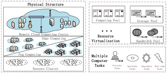 Recently, cross-layer cloud computing systems, as shown in Figure 1, have become more and more important in people’s daily lives, particularly with the development of various computing technologies. The cross-layer cloud computing system is a cloud computing environment that uses a mix of the local edge computing or the fog computing cloud, the remote cloud data center and other types of cloud platforms to support the device cluster. Edge computing or fog computing is usually deployed near the users and is in charge of delay-sensitive tasks and basic data pre-processing [1]. The remote cloud data center is usually responsible for computation-intensive tasks [2]. In this way, organizations are able to provide computer services with orchestration among these different platforms based on their requirements.