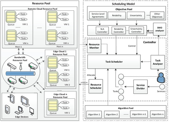 There are also some works that study the specific algorithms of computer task scheduling in the cloud environment. Farahabady et al. [13] explored how resources in the cross-layer-cloud environment should be used to run bag-of-tasks applications. Considering the deadline and the cost limitation, Zuo et al. [14] put forward a multi-objective scheduling method oriented by tasks based on ant colony optimization in a cross-layer cloud environment, with the purpose to optimize the restricted pool of edge and public cloud computing resources. Yuan et al. [15] proposed a temporal task scheduling algorithm that combines the energy price of edge cloud resources with the execution price of public cloud resources. Chang [16] studied the task scheduling algorithm and resource allocation algorithm to minimize data transmission energy cost in the cross-layer cloud. Zheng et al. [17] focused on how to improve the performance of social welfare, enlarge cloud bandwidth utilization, as well as increase the satisfaction ratio of the tenant in their study. The method aims to minimize the computational cost and time. An optimization model is established, which can obtain the approximate global optimal solution according to the situation of tasks. The above specific multiple computer task scheduling methods focus on how to adjust the allocation of resources according to the specific requirements of a certain service. They do not consider the universal heterogeneity of tasks in an actual cross-layer cloud system and, therefore, do not meet the diverse needs of cloud users.