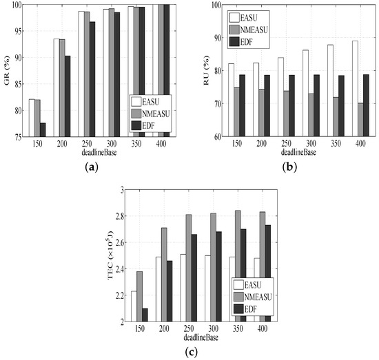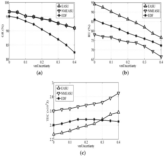 As shown in Figure 3a, all three algorithms’ climb as rises, as more tasks will be completed prior to deadlines, and the mechanism of resource scale-up is not needed. It also can be found that the of EASU and NMEASU is higher than EDF. The reasons can be easily found. Firstly, more tasks satisfy their deadline because EASU and NMEASU have higher priority. Secondly, EASU and NMEASU are more flexible and are able to achieve the dynamic allocation of resources to accommodate more tasks. Finally, EASU takes the uncertainties into consideration, and NMEASU has a better quality of scheduling.